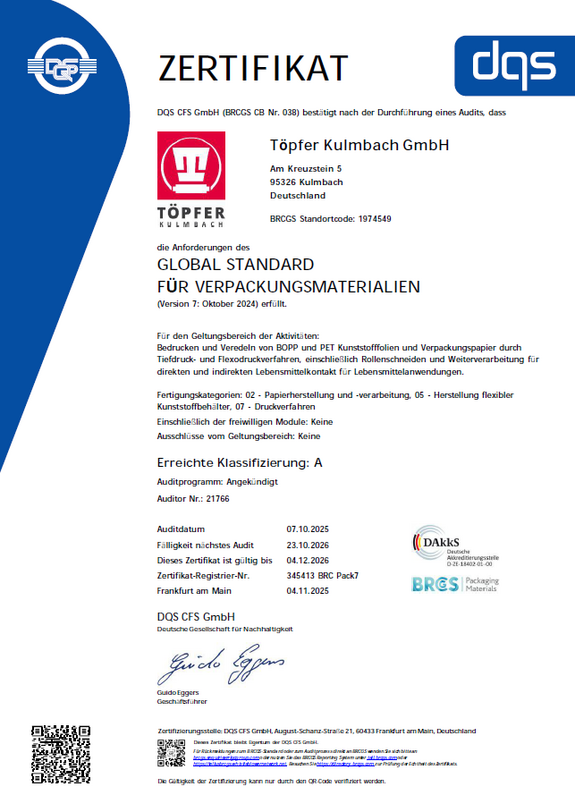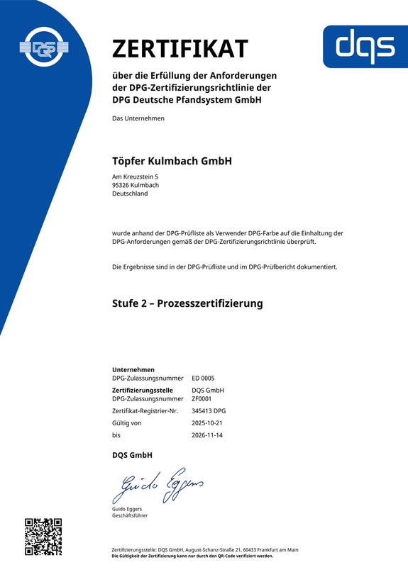 Töpfer Kulmbach erfüllt alle Anforderungen der Zertifizierungsrichtlinie der DPG Deutsche Pfandsystem GmbH.